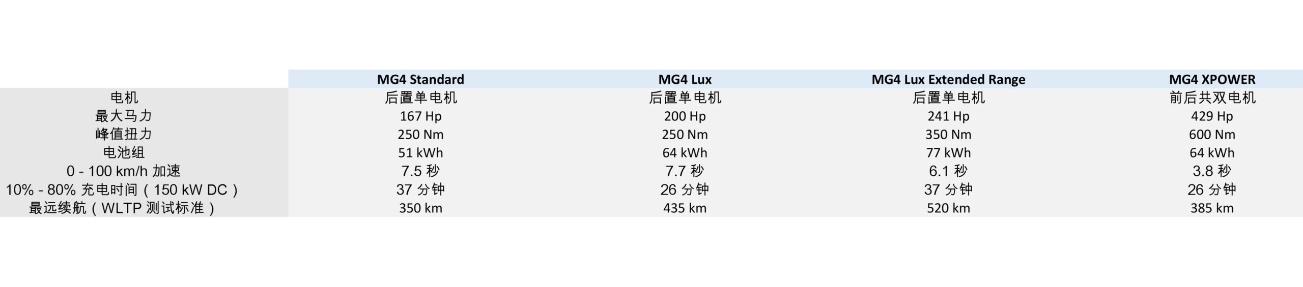 至于动力配置的部分,原厂几乎将海外市场的所有规格都引进了马来西亚,以下为 MG4 的四个车型电池组和动力细节: