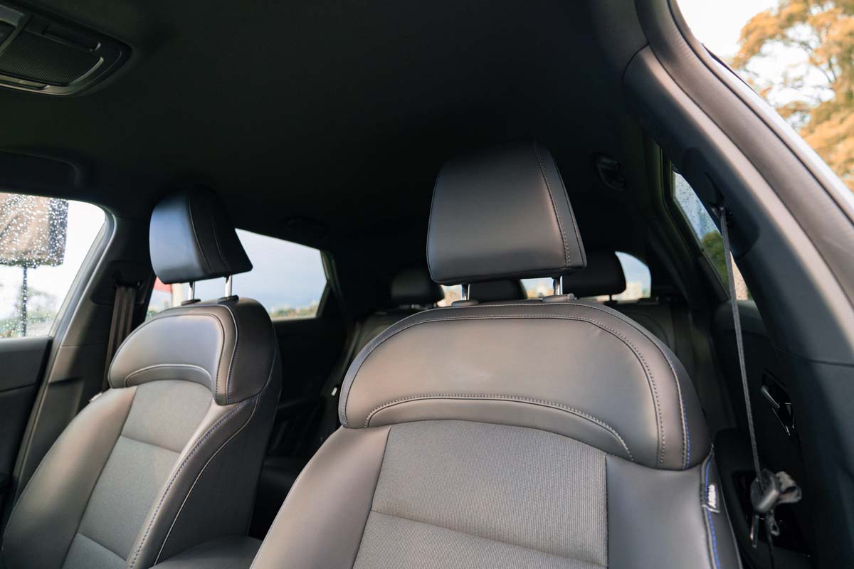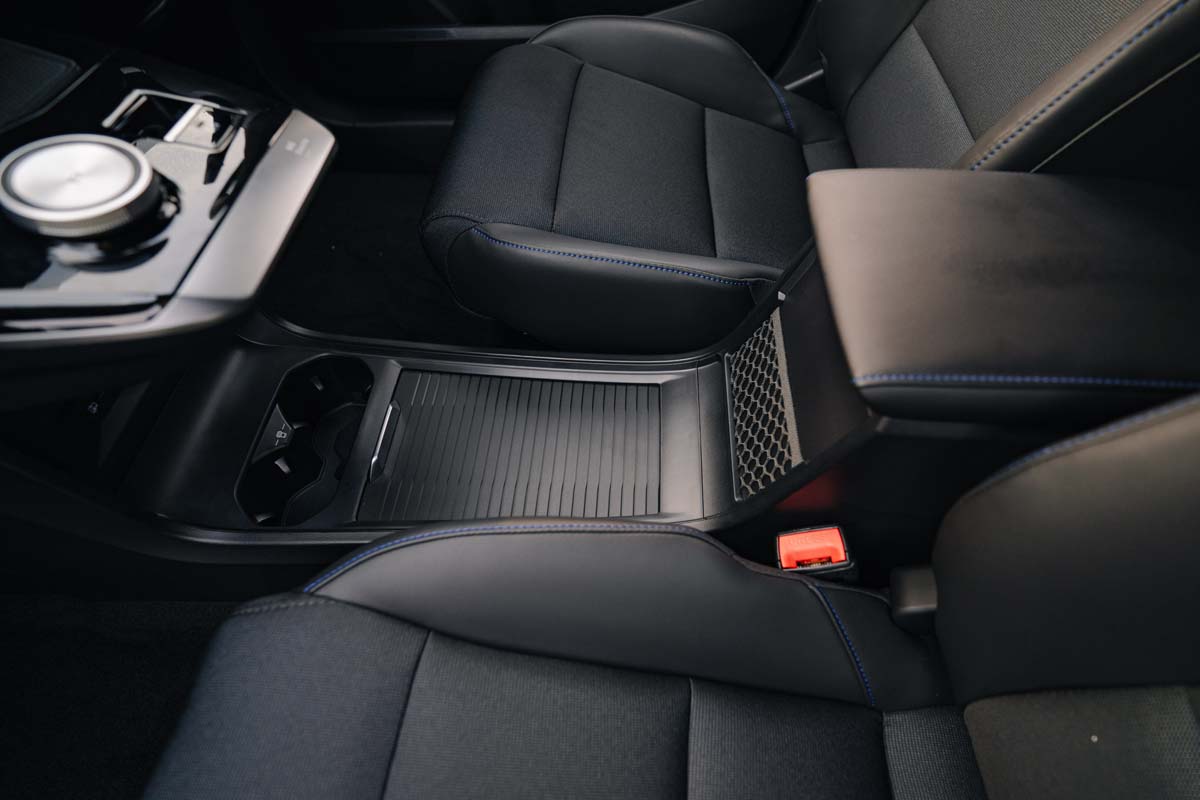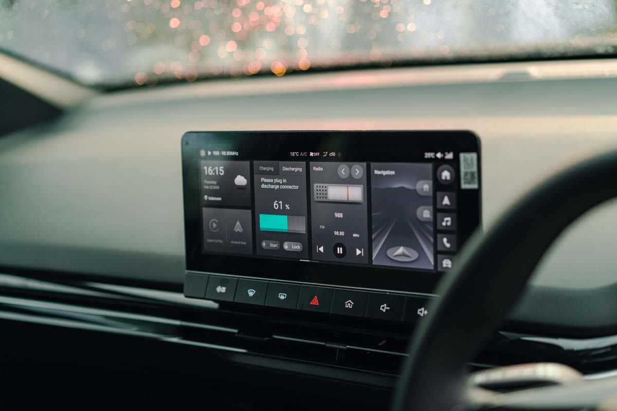 内装设计部分采用简约设计风格,包含了11.25寸的触屏主机以及7英寸的数位化仪表,同时保留了一些实体按键,不过一些功能依旧需要通过触屏实现(例如调整温度)。在换挡方式部分采用悬浮式设计和转钮,拥有电子手刹车和无线手机充电基座,并且需要数据线连接的 Android Auto 和 Apple Carplay,中控台上方拥有大量的软质塑胶,质感部分呈现的还不错,但是四个门板均为硬质塑胶,并且没有后座冷气出风口。