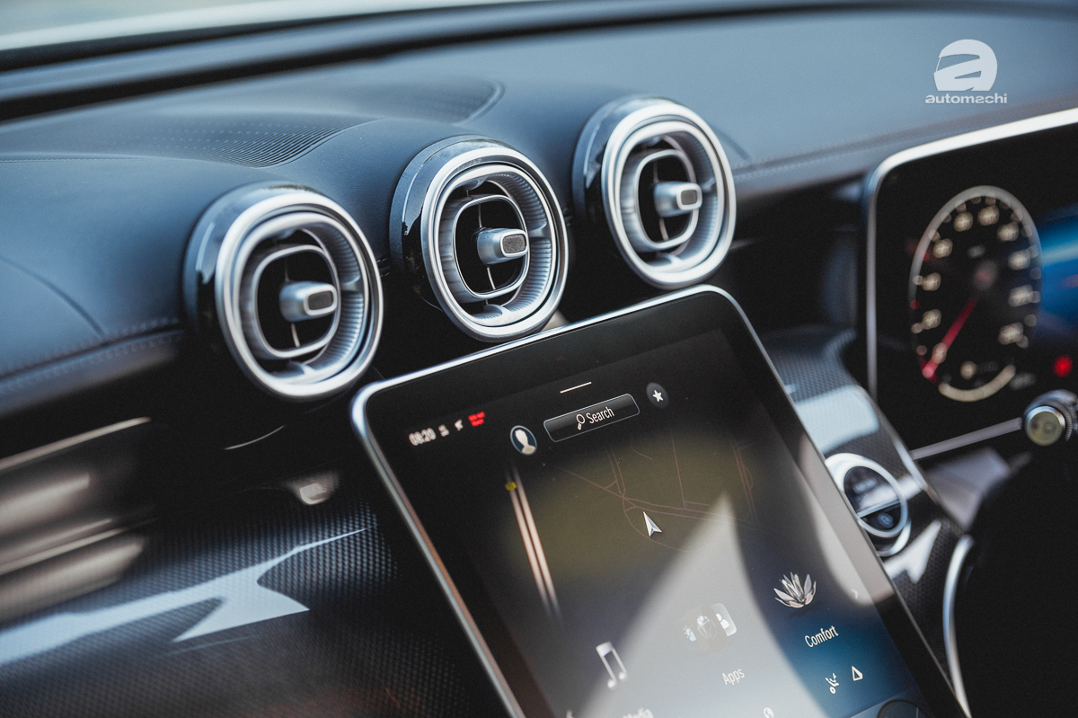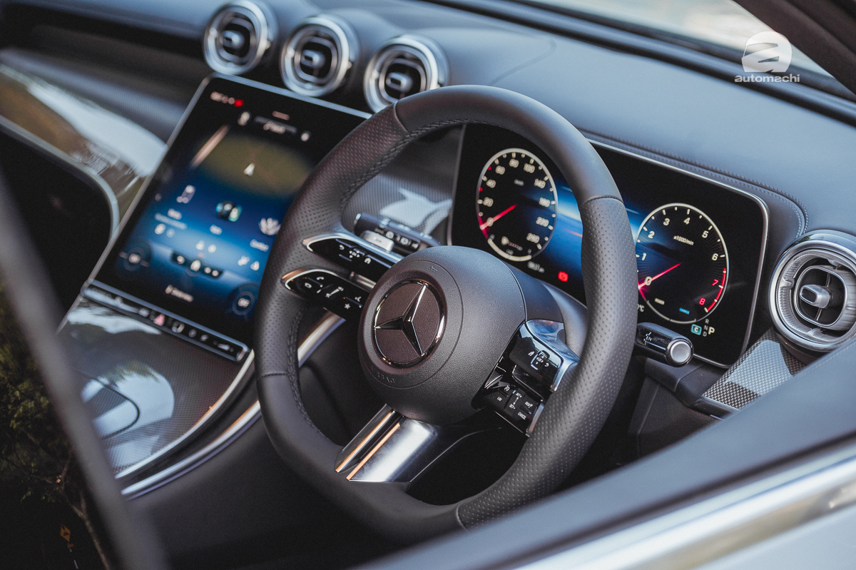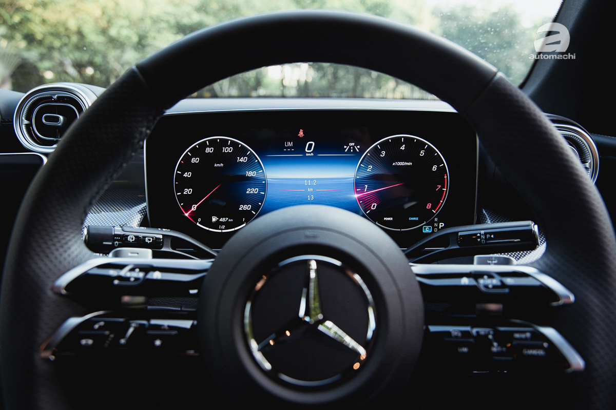 来到内饰,这款车用上了原厂最新的家族设计语言,包括了 12.3 寸全液晶仪表和 11.9 寸 MBUX 触屏主机,可以支援 Apple CarPlay 和 Android Auto,另外它还有原厂著名的 64 色氛围灯设计,晚上开车氛围感十足,同时它的 AMG Line 方向盘和 Paddle Shift 换挡拨片可以带给你更出色的驾驶乐趣,其余配置像是手机无线充电面板、Burmester 3D 高级环绕音响、MBUX AR 导航功能都能在这款车上看到。