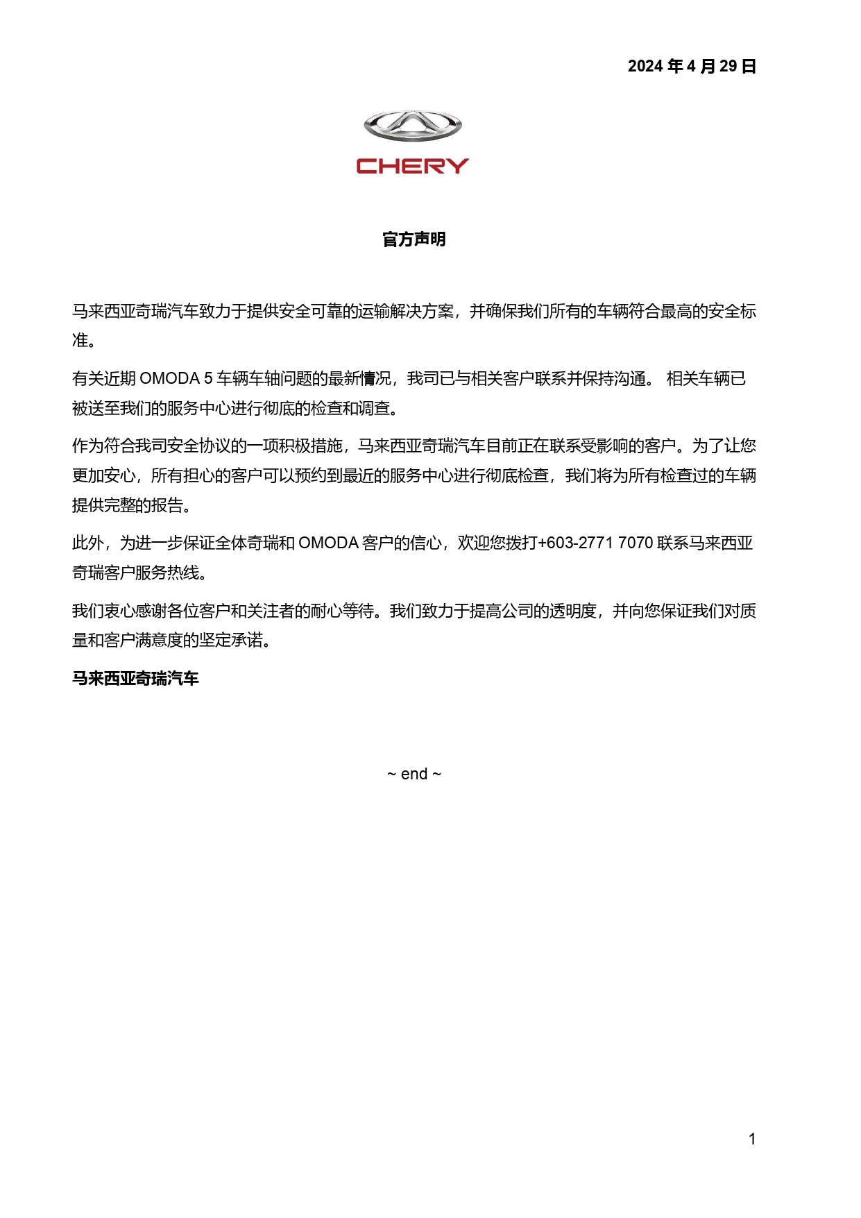 Chery Omoda 5 后轴脱落事件官方回应:已第一时间进行处理,其余车主如有疑虑可预约进行检查。