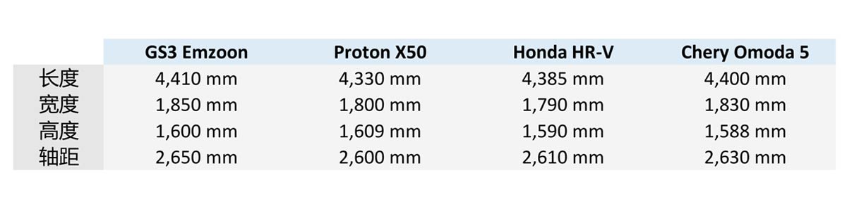 这一次全新的 GS3 Emzoom 的定位是一款 B-Segment SUV,而它在本地对标的竞争对手就是 Proton X50、Honda HR-V 及 Chery Omoda 5 等热销车款,新车本地分为 Executive 及 Premium-R 双车型可选,而这款车主打的就是时尚运动风格,整个外形设计偏向机甲风,加上 Premium R 车型独有的 R Style 运动套件及带阀门的中置双出排气尾管,相信这款车对于年轻人会很有吸引力。
