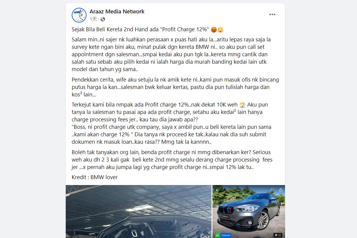 那这则贴文在发布后就在网上引起热议,有者说这是一些车商的套路,先放便宜的车价吸引消费者上门,再通过后续征收其他的费用来确保自己能够获得足够利润,也有者说如果加上所谓的 Profit Charge 之后才是车子真实的售价,因此加完全部的费用后车价其实就和其他二手车商的市价差不多了,