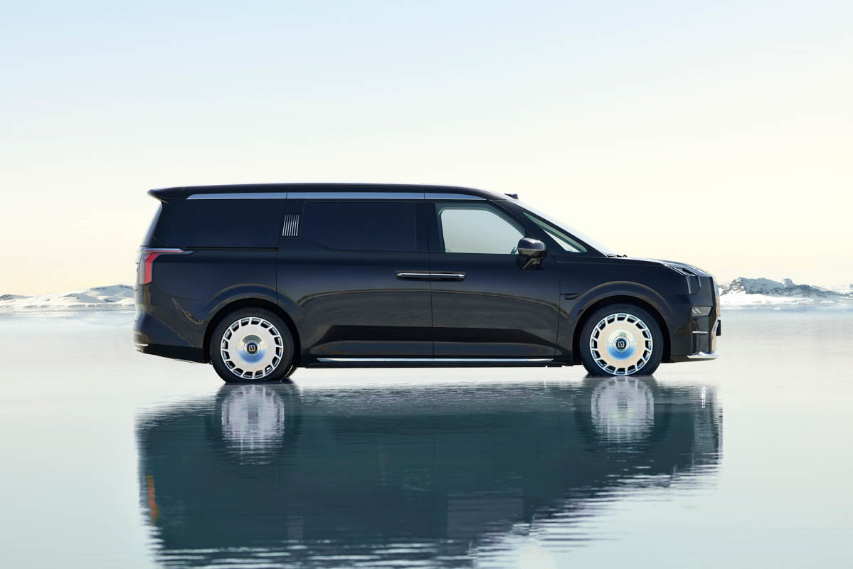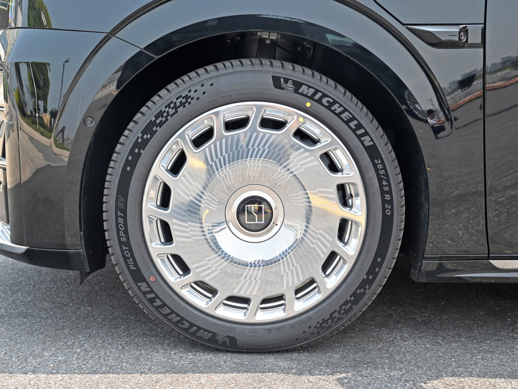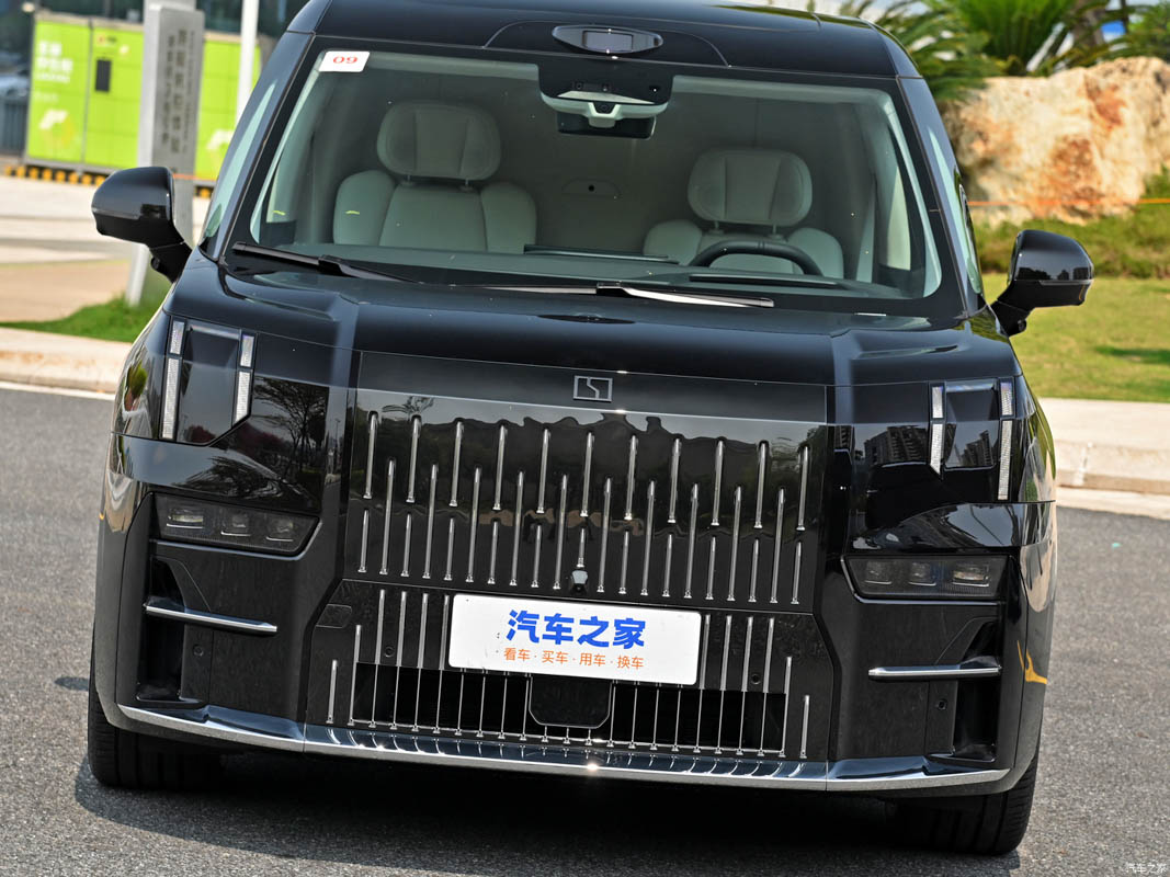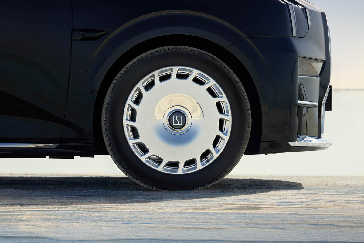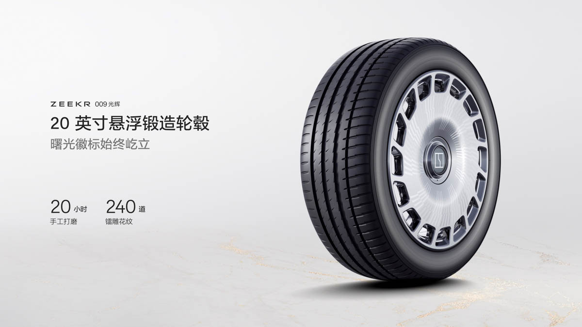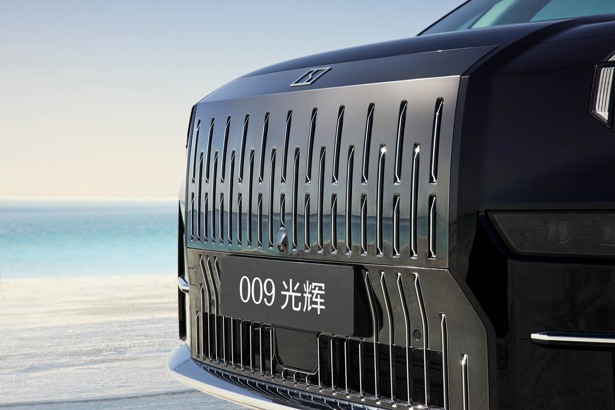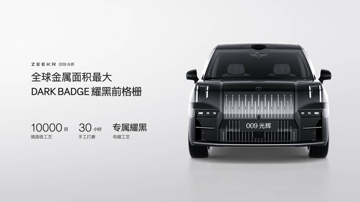 这一次在光辉版上这款车仅有极夜黑一个车漆颜色可选,而它前脸走的也是黑武士一般的风格,可以看到不同于一般极氪 009 上大面积的镀铬水箱护罩,它用上名为 Dark Badge 耀黑前格栅的水箱护罩设计,同时车顶还有一个用于侦测路面的激光雷达,而它整车仅有前唇及车侧顶部有镀铬材质,以及一个类似于 Rolls-Royce 及 Maybach 等超豪华车款上的 20 寸“大饼”锻造轮圈,至于车尾也和普通版保持一致,可以看到中间有 ZEEKR 的字样的贯穿式尾灯,而它用上金色的“极氪”及“009 光辉”的尾标来表示它和普通极氪 009 的不同。
