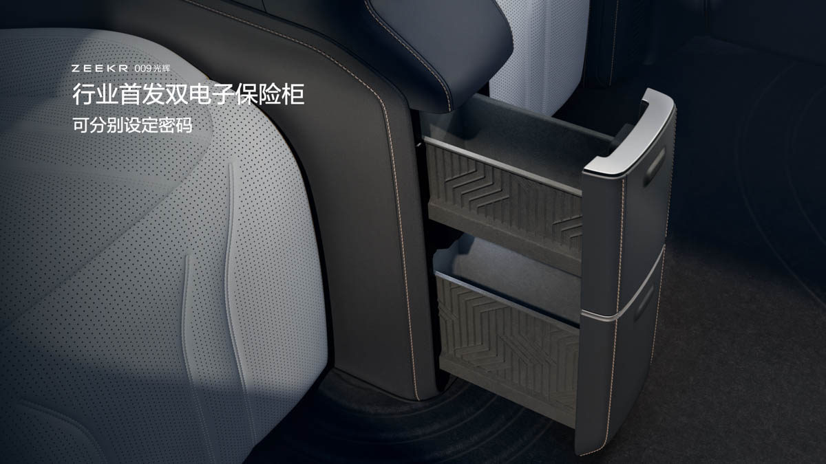 在内饰基本上它的前排就和普通版极氪金 009 大同小异,有着 10.25 寸全液晶仪表、15.05 寸中控触屏主机及 35.95 寸 AR-HUD 抬头显示器等等,而这款车仅采用 4 座的座椅布局,它的后排是两张独立的头等舱座椅,这个座椅不仅拥有多达 24 向的电动调节,而且还有 7 区石墨加热,20 个按摩点位等等,全方位确保老板的乘坐舒适性,而且它还配备了内置 ZEEKR OS 6.0 的 43 寸超大后排 4K 屏幕及一个 8 寸的智能控制屏,加上 31 个扬声器的 Yamaha 高级音响,不仅能为后排老板提供娱乐,就算要开线上会议它也能够轻松胜任,而且它还有一键隐私模式,确保你的资料不会外协,加上有着 LC 隐私调光玻璃,也能最大限度保护后排老板的隐私,以及后排两个电子保险箱能够让老板储存贵重物品,可说是全方位都为老板们考虑到位了。