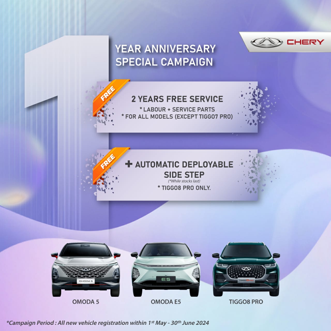 为欢庆成立一周年,Chery Malaysia 近日就推出周年庆特别优惠,凡在 2024 年 5 月 1 日至 6 月 30 日期间注册的 Omoda 5、Tiggo 8 Pro 及 Omoda E5 将可享有 2 年 Free Service 的优惠。
