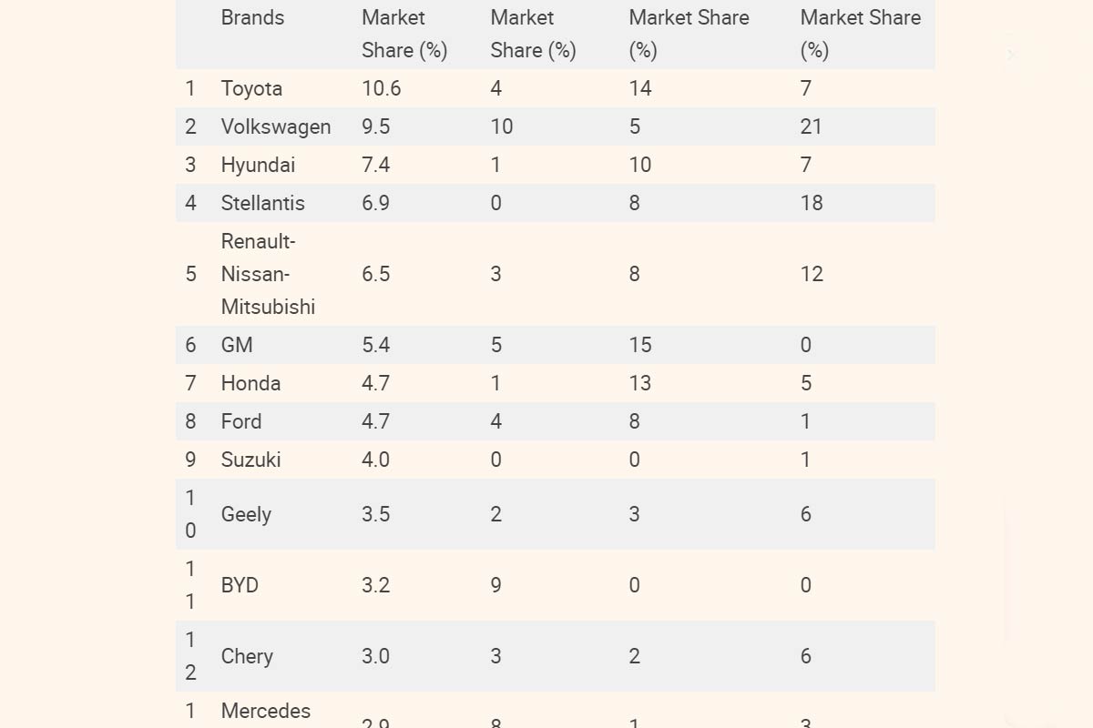 那如果是看今年的第一季度的话,在全球销量排名前二十的车企中,就有五家是来自中国的汽车品牌,其中我们熟悉的 Geely 在今年第一季度就凭借着 738,400 辆的销量,3.5% 的市场占有率成功冲进榜单第 10 名,是所有中国车企中排名最高的,而排在他们之后的就有 BYD(市占率 3.2%)、Chery(市占率 3.0%)、Changan(市占率 2.6%)及 SAIC(市占率 1.7%)。