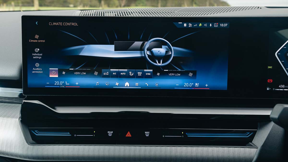 来到内饰这款车就用上了宝马新一代的双联屏设计,分别是 12.3 寸全液晶仪表,14.9 寸中控触屏主机,同时里面也内置了原厂最新的 iDrive 8.5 操作系统,另外它的中央鞍座也从经典的鸡腿挡把改换成了更为小巧的挡把设计,而且原厂很巧妙地把氛围灯融入了中控台的饰板内,整个车内的视觉效果可谓是相当吸引眼球。