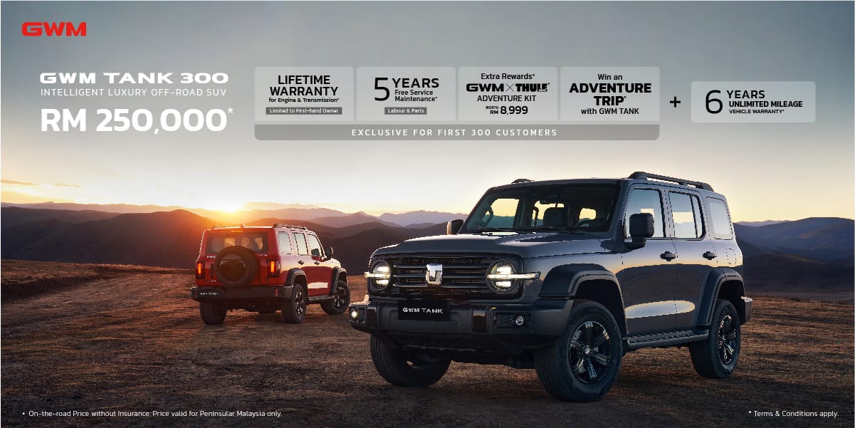 GWM Tank 300 的上市将为马来西亚 SUV 市场注入新的活力。凭借其强大的动力、卓越的越野性能和豪华的配置,Tank 300不仅适合城市驾驶,也为越野爱好者提供了更多的选择。现已开放预订,起售价为RM 250,000,期待这款全新SUV在马来西亚市场上的表现。现已开放预订,首300位预订客户可享受优惠。