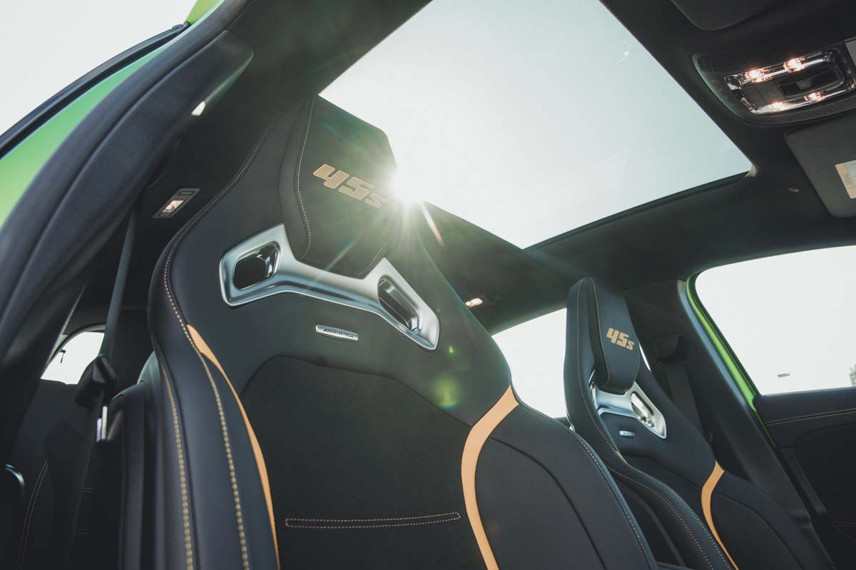 此次推出的 A45 S 4MATIC+ 特别版在设计上独具一格,车身采用“AMG 绿色地狱磨砂漆”,这一颜色首次将 Mercedes-AMG GT 和 Mercedes-Benz G-Class车型的独特配色带入紧凑型车市场。车身两侧饰有 AMG 标志性涂装,车门上有醒目的“45 S”字样,车头引擎盖上也印有 AMG 徽章。整车搭配19英寸亚光黑AMG锻造轮毂,七辐式设计更显动感,而黄色对比色则进一步突出其视觉冲击力。轮毂的颜色与 AMG 高性能刹车系统的黑色亮面刹车卡钳相呼应,卡钳上还印有白色的 AMG 标志。车身细节方面,专属的 AMG 燃油加注口盖以及车门投影灯也为整车增添了精致感。