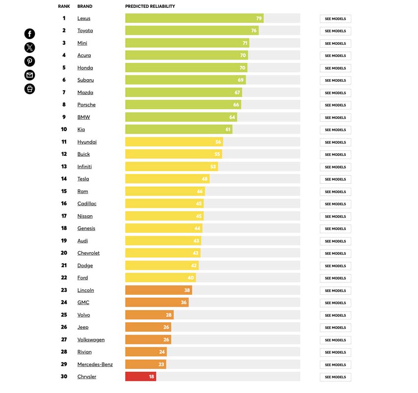在榜单的下半部分,多个品牌的可靠性评分较为令人失望。特别是美系品牌表现最差,Ram仅得46分,Chevrolet和Dodge分别得43分和42分,而著名的Ford和Lincoln则分别获得了40分和38分的低分。