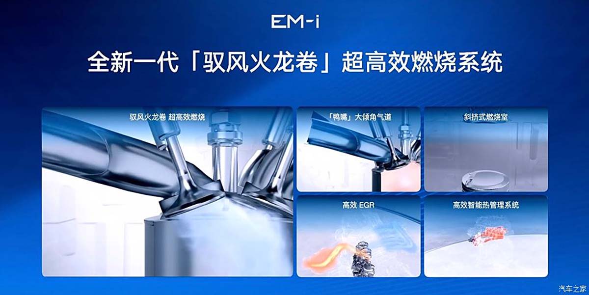 EM-i 主要针对的是节能优化和超长续航,适用于那些希望在减少油耗的同时享受更长里程的用户。- 新一代”驭风火龙卷”高效燃烧系统:通过改进进气道设计,实现高效的空气燃烧。
