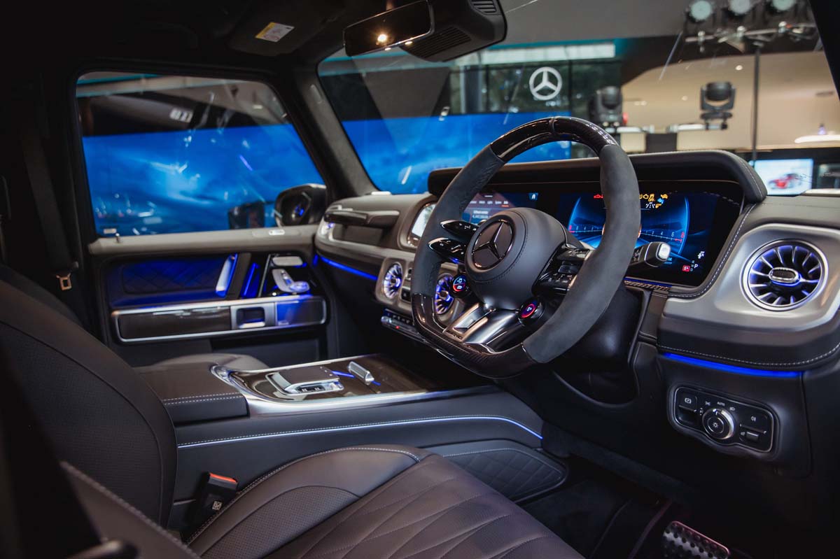 而当我们打开车门后,里面的一切完美的诠释了什么是豪华+运动。全新AMG 家族的方向盘,和全新的 MBUX 娱乐系统让整个驾驶座舱显得更加舒适豪华。除此之外,全新小改款的 G63 也在氛围灯系统里加上高达20个全新的颜色,让你在晚上时能够拥有更完美的驾驶体验。