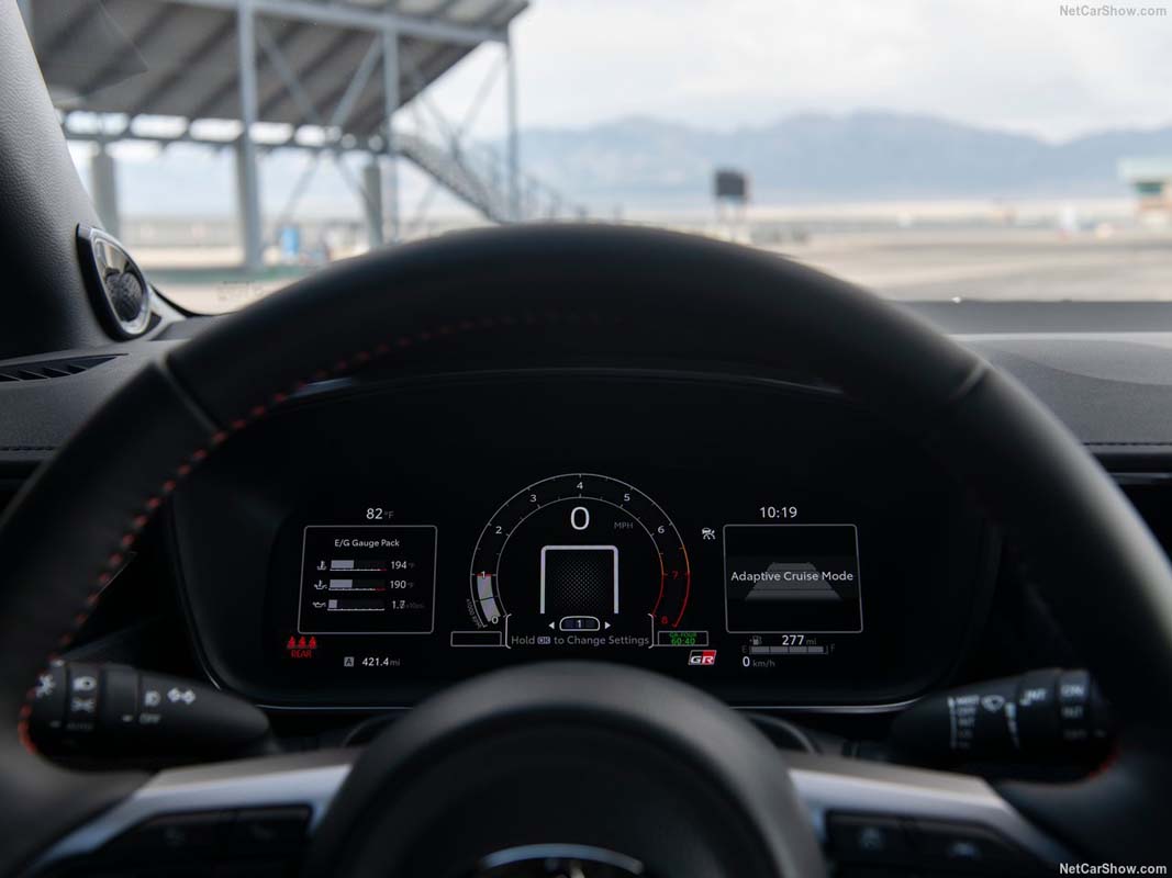 在车内,GR Corolla 配备了运动感十足的座椅和高科技内饰。液晶仪表盘与中控触摸屏相结合,提供清晰的驾驶信息和便捷的操作体验。整体设计不仅彰显运动风格,也兼顾日常实用性。