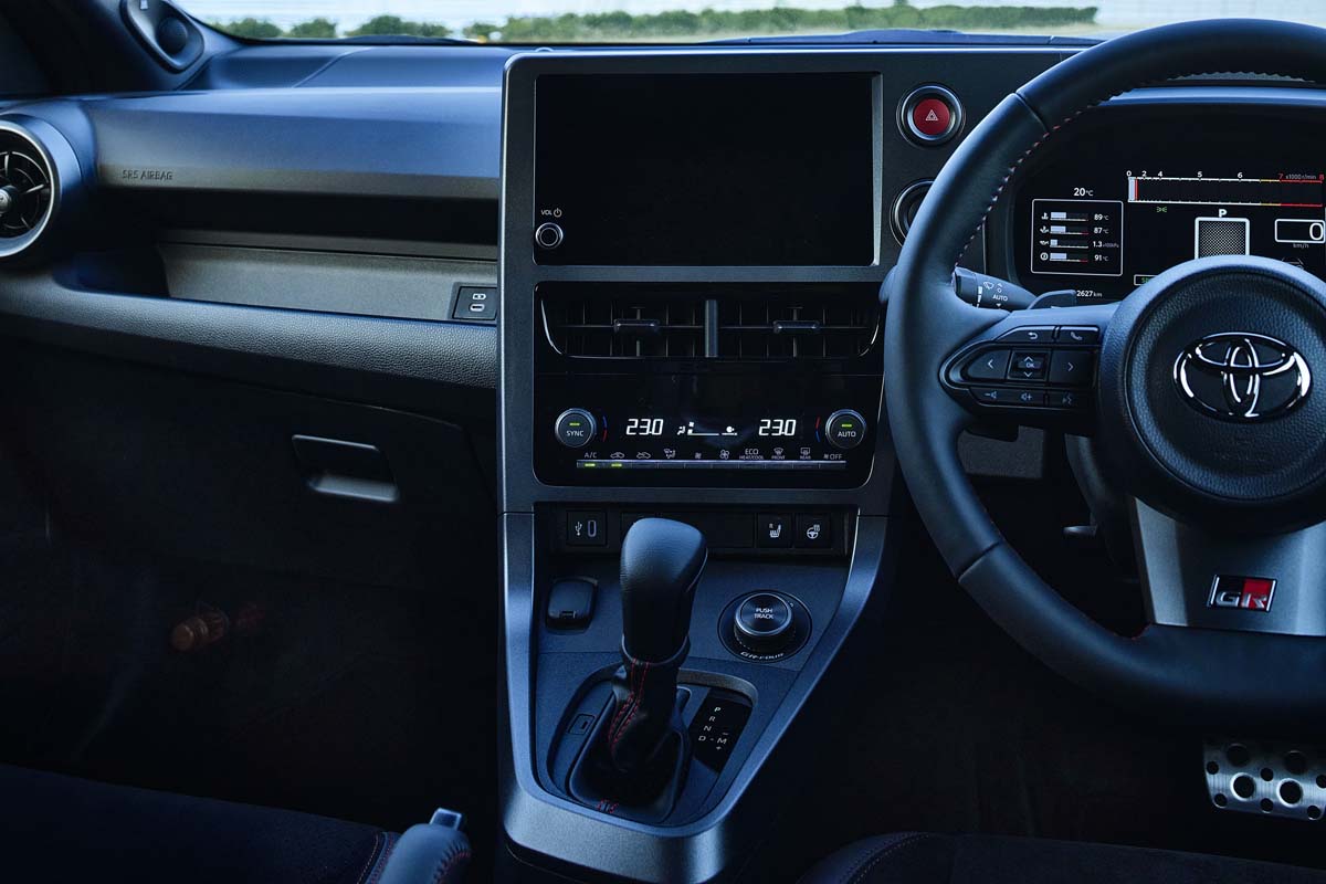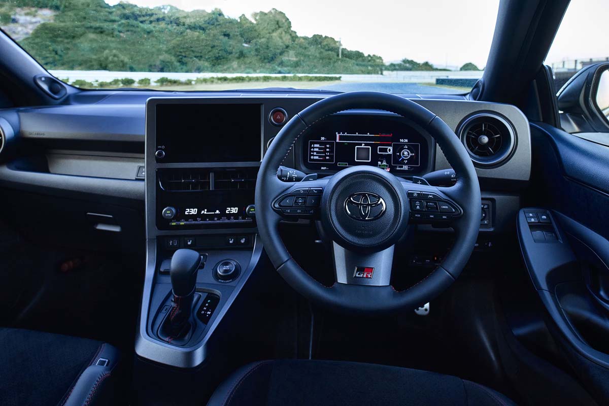 2025 GR Yaris 的内饰同样进行了显著的改进,以“驾驶者优先”为核心理念打造。仪表板的上缘降低了50 mm,后视镜的位置也进行了调整,同时将控制面板向驾驶者倾斜了15度,以提供更好的视野和操作便利性。