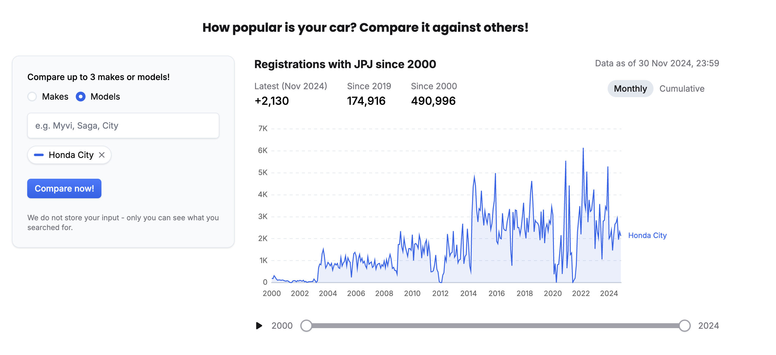 根据图表显示,Honda City在2024年11月新增了2,130台的注册量,自2019年以来的累计销量更是达到了174,916台。这表明尽管市场竞争激烈,但Honda City依然能够保持良好的销售势头。