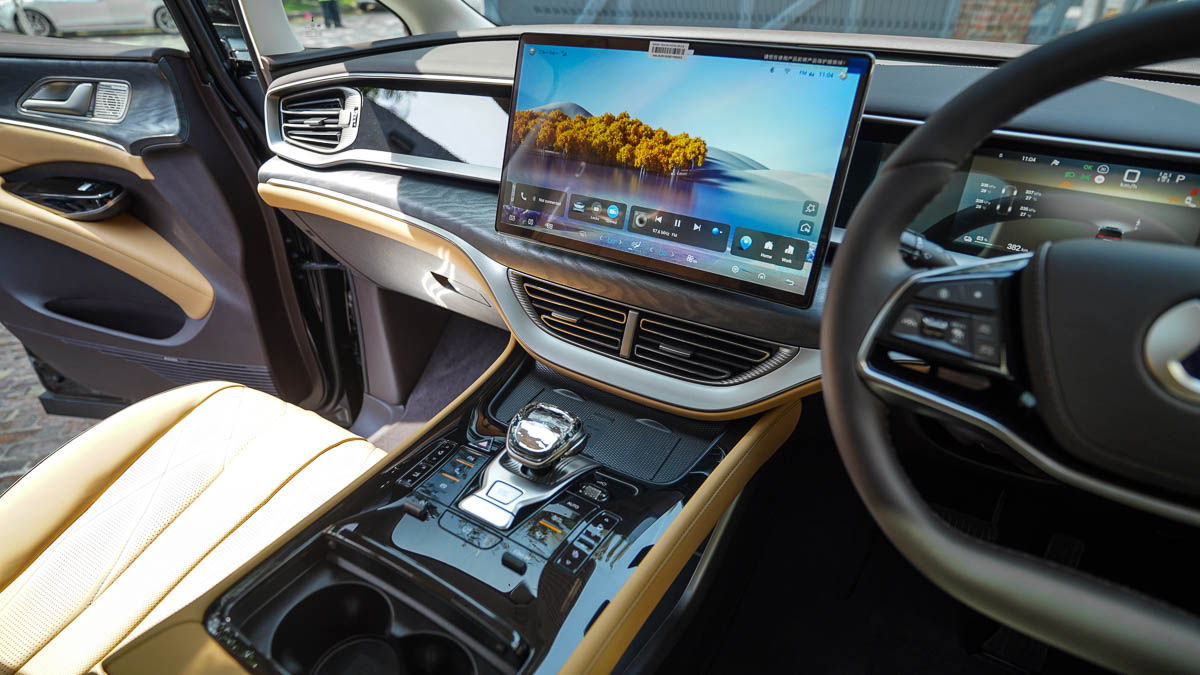 内饰空间是Denza D9的一大亮点。该车能轻松容纳七位身高达180厘米的成年人,行李厢空间亦充裕,可容纳七只20英寸行李箱及七个商务背包。得益于出色的隔音设计,车速达到120 km/h时,车内噪音仅为64.6 dBA,营造出宁静的驾乘环境。