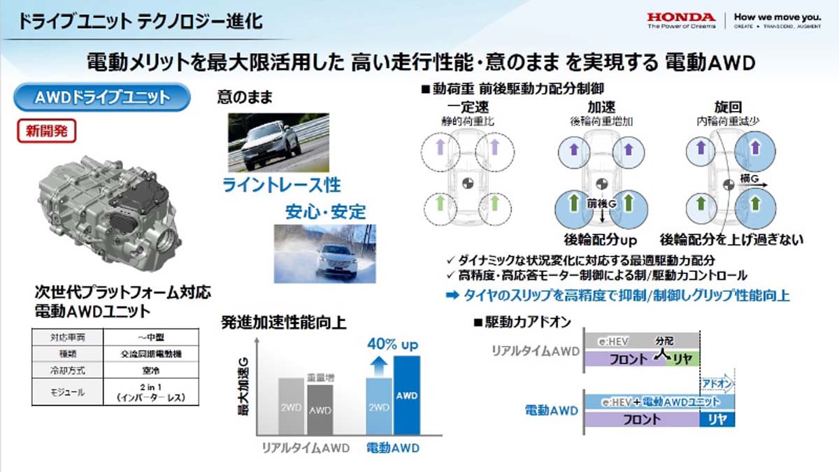 新一代e:HEV系统中引入了电动AWD技术,这一技术通过高精度的前后驱动力分配,实现了更出色的稳定性与动态响应: