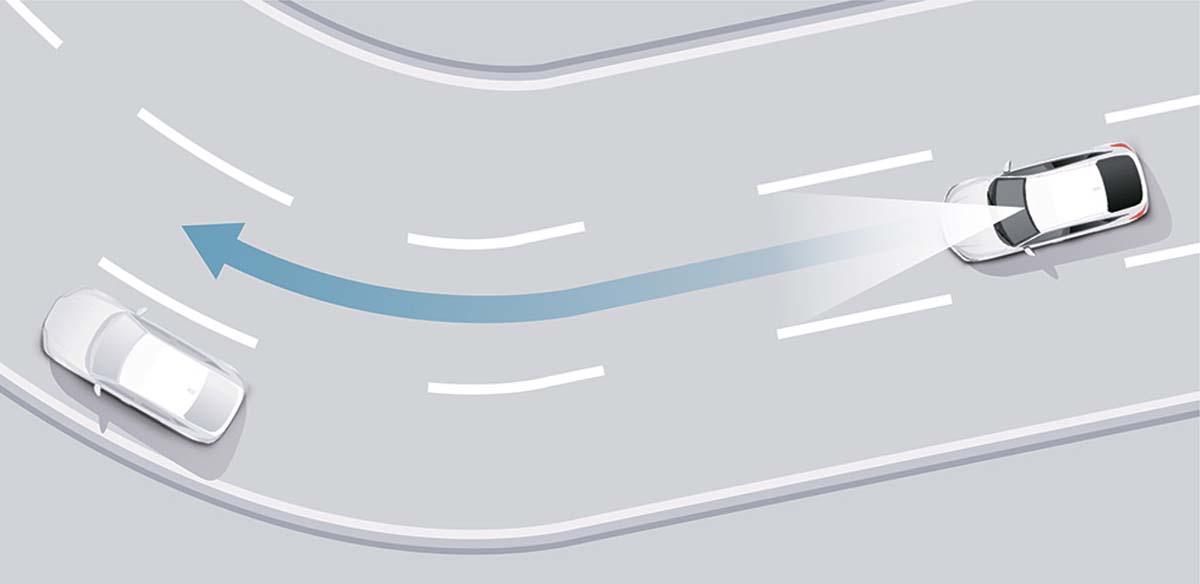 当系统检测到前方有车速较慢的车辆时,会评估周围环境,并判断是否具备安全超车条件。确认后,系统会提醒驾驶者,通过驾驶者在手边操作开关进行超车确认后,自动完成转向灯控制、加减速以及车道变换操作。此外,在导航引导模式下,系统还能根据导航路线主动建议并协助完成车道变换,助力驾驶者更顺利地抵达目的地。 - 弯道偏离早期警报