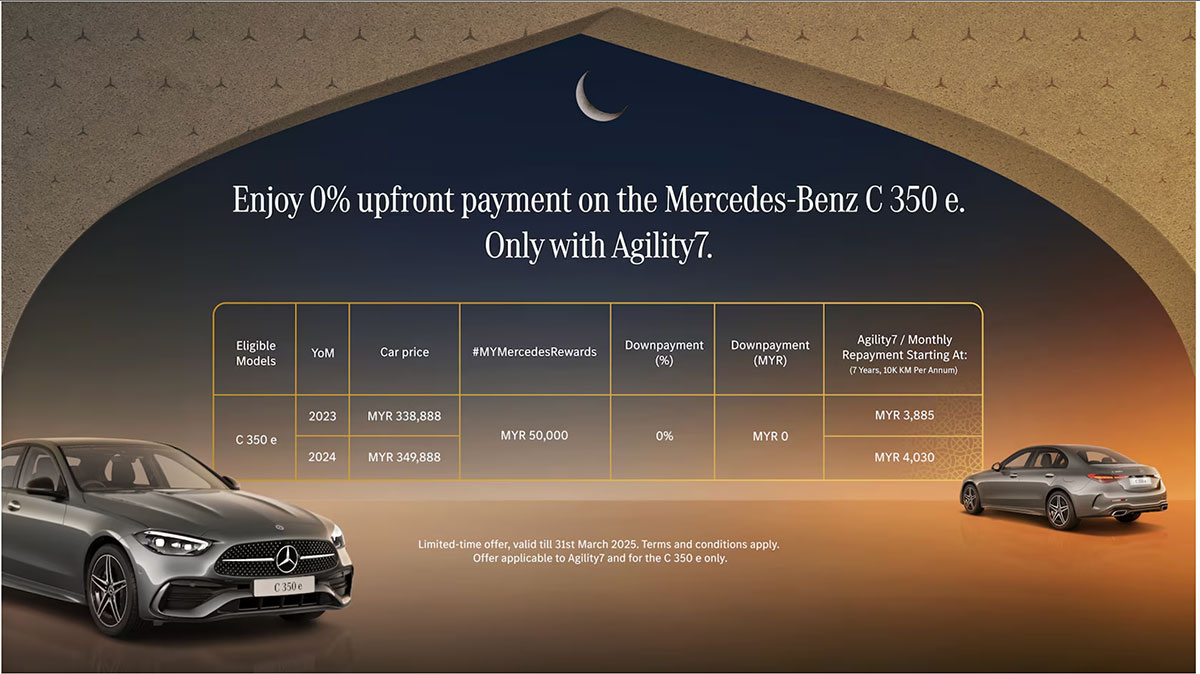 根据最新 Mercedes-Benz Malaysia 推出的 Agility7 融资计划,您可以选择 0% 首付或预付 RM 50,000,享受更为灵活的月供方案。以下表格展示了最新的付款方案(优惠至 2025 年 3 月 31 日):