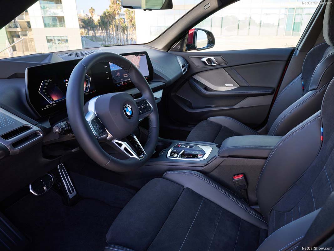 进入座舱,三辐运动方向盘与全数字 BMW 曲面显示屏形成视觉焦点——10.25 英寸仪表盘与 10.7 英寸中控屏无缝连为一体。车内对角线铝制背光饰条与环境氛围灯相呼应,Illuminated Aluminium Graphite 饰条、Veganza 穿孔皮质座椅等高级材质,将细节质感提升到新高度。重新设计的中控台融入杯架、无线充电托盘与灵活储物空间,看得见的实用与美学兼顾。