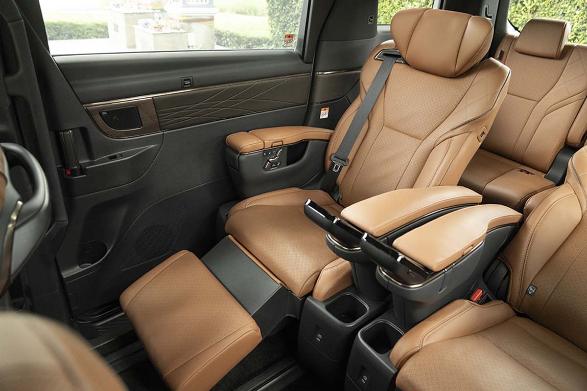 车内设计延续Alphard一贯的高级氛围,2nd Row Executive Lounge座椅不仅有腿托、通风、加热、按摩,甚至还有电动折叠桌、专属平板遥控器与柔和氛围灯。主驾驶座也具备 Welcome Seat 功能,能在上下车时自动滑移,提升便利性与仪式感。