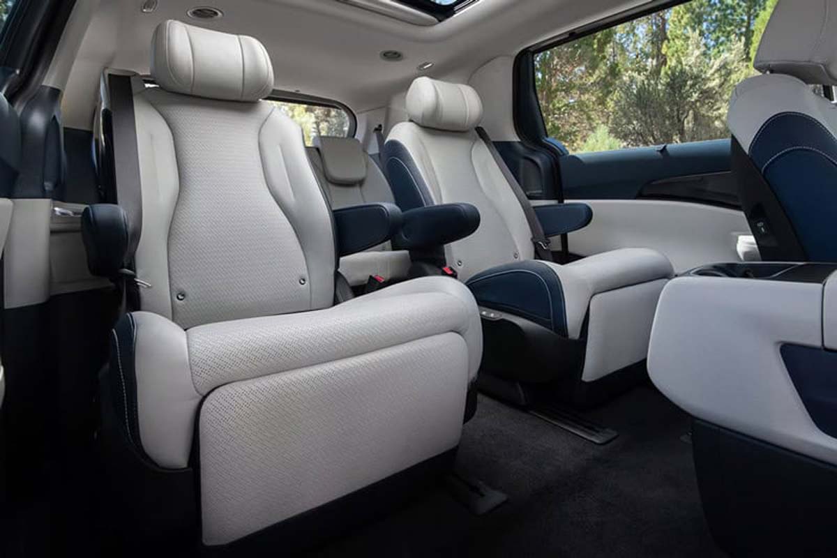作为一款家庭MPV,座椅的舒适性是重中之重。新款 Carnival 采用三排七座布局。前排座椅支持电动调节,驾驶座还附有记忆功能,双前座均配备了通风功能。第二排则是两张独立的 Captain Seats,不仅支持电动调节,更带有可伸展的腿托和一键“放松模式”(Relaxation),让乘客能以最舒适的姿势休息,同时第二排座椅也具备通风功能。第三排座椅则采用60:40分离式设计,椅背可调节,并能完全收折至底板下,形成一个平坦的储物空间。