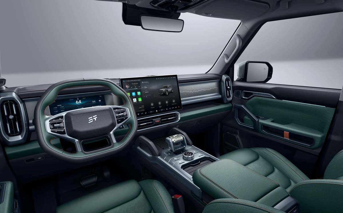 在用料方面,T2 预计将大量使用皮革和软质材料包裹,并辅以粗壮的门把手和金属质感饰板,试图在豪华感和越野氛围之间找到平衡点。