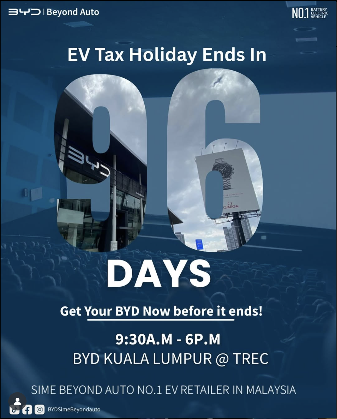 BYD KL 在此向所有关注电动汽车的消费者发出提醒:购车的最佳时机所剩无几!马来西亚政府为鼓励绿色出行而设定的全进口(CBU)电动车税务豁免政策,已正式进入最后倒数阶段,至于 CKD 车型则是可以延长一年至2026年。