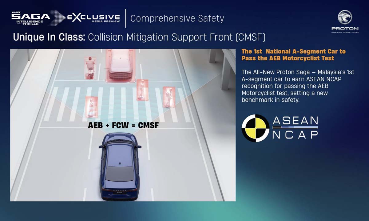 其中 CMSF 更是亮点,它结合 AEB 与 FCW,让新 Saga 成为 马来西亚首款通过 ASEAN NCAP AEB 摩托车测试的 A-Segment 车型。这是一个在本地市场非常实际的测试标准,因为你我都知道,日常道路最常遇到的风险对象就是摩托车。