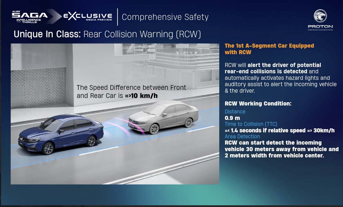 Rear Collision Warning 同样是 Saga 首创,能在后车以 ≥ 10 km/h 的速度差逼近时主动亮起 Hazard 并发出提示,甚至在 30 米距离就能开始侦测,降低被追尾的风险。