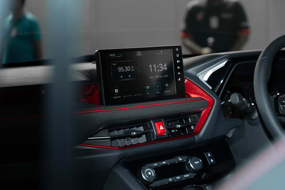 配备部分,Traz 也明显比过往 Perodua 产品更“到位”。包括电子手刹、可调式方向盘、后座中央扶手、Type-C 后座 USB 充电孔、前后迎宾灯以及原厂前方 DVR 都列入清单。中控系统支援 Android Auto 与 Apple CarPlay,同时提供 360 度环景影像 与自动恒温空调,这些都不再只是高阶版本的点缀,而是直接朝主流家庭用户需求靠拢。
