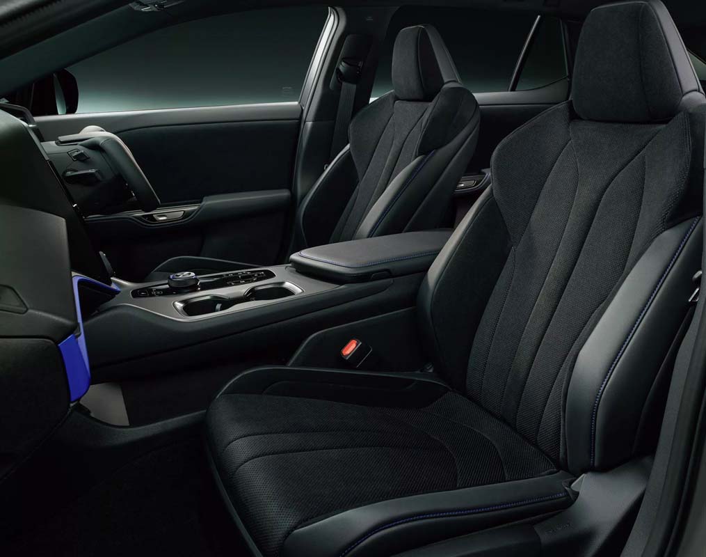 走进车内,RZ600e F-Sport Performance 延续 Lexus 一贯的高质感路线,但整体氛围明显更偏向驾驶者。F-Sport Performance 专属运动座椅采用一体成型结构,支撑性更强,在激烈驾驶时能稳稳固定身体,同时仍保留长时间乘坐所需的舒适度。内装以深色为主调,搭配蓝色缝线与细节饰条,强化电动性能车型的专属识别。