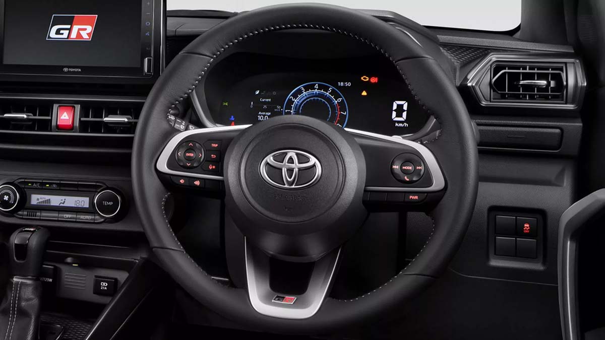 车内则全面黑化处理,座椅与内饰采用黑色基调,并辅以对比色缝线点缀,连车顶内衬也一并换成深色,营造出更浓厚的运动氛围。配备方面相当齐全,9 寸中控屏幕、7 寸数位仪表,以及完整的 ADAS 主动安全系统都没有缺席。GR 标识方向盘不仅提升视觉感受,也加入换挡拨片与“Power”模式按钮,让驾驶者在操作层面多了一点参与感。
