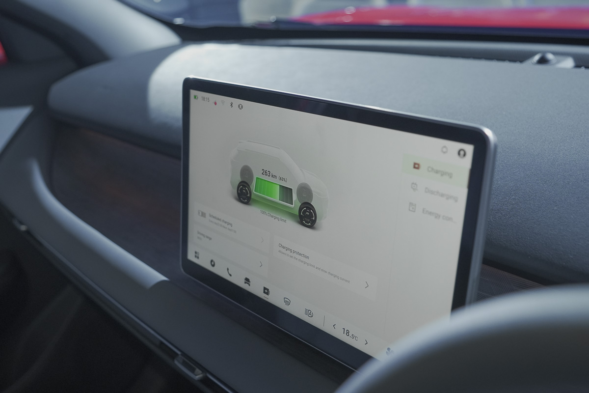 进入车内,Vigo EV 走的是目前主流的极简科技风格。中控台以大尺寸触控荧幕为视觉核心,大多数车辆功能被整合至车机系统内操作,实体按键数量大幅减少。全液晶仪表、电子旋钮排挡以及电子手刹等配备也没有缺席,整体氛围符合 RM 100k 级电动车应有的水准。