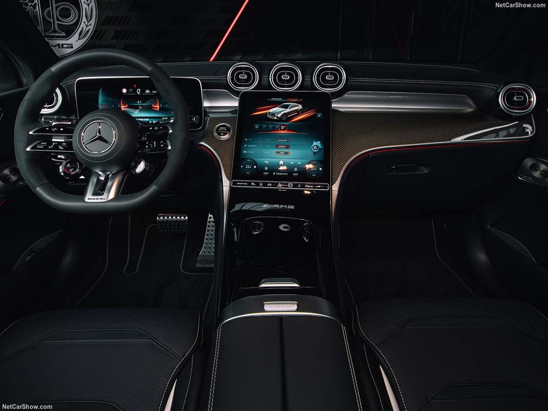座舱部分,新车采用最新一代 Mercedes 数位化驾驶舱架构,双联屏设计结合 AMG 专属 UI 介面,可显示赛道数据、G 值、动力分配等性能资讯。方向盘整合驾驶模式旋钮与快捷控制键,搭配 AMG 跑车座椅、碳纤维饰板与金属踏板,营造出明显区别于普通 GLC 的战斗氛围。