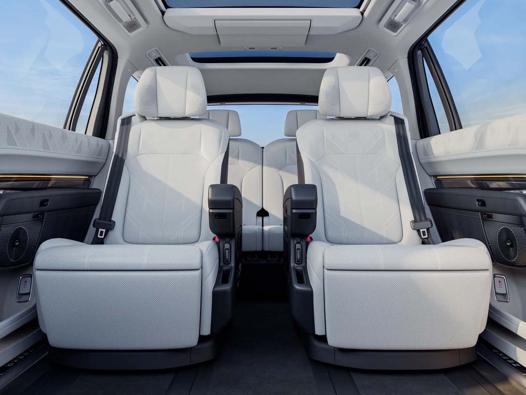 进入车内,Zeekr 9X 的重点不只是“科技多”,而是“豪华感到位”。中控台采用大量皮革、木饰板与金属饰条混搭,整体布局更偏向传统豪华而非极端未来风。大尺寸中控屏负责车载系统与多媒体功能,搭配全数位仪表与副驾娱乐屏,科技配置一应俱全。座椅强调宽大与舒适,预计会提供四座或六座高端布局,后排更是重点区域,独立行政座椅、电动调节、通风加热、按摩功能,以及高阶音响系统,都让它更像一辆可以“被司机驾驶”的豪华座驾,而不是单纯追求操控的 SUV。