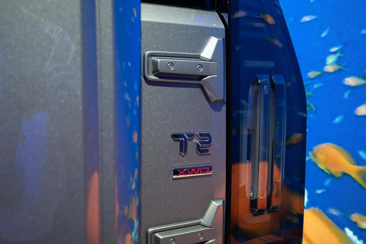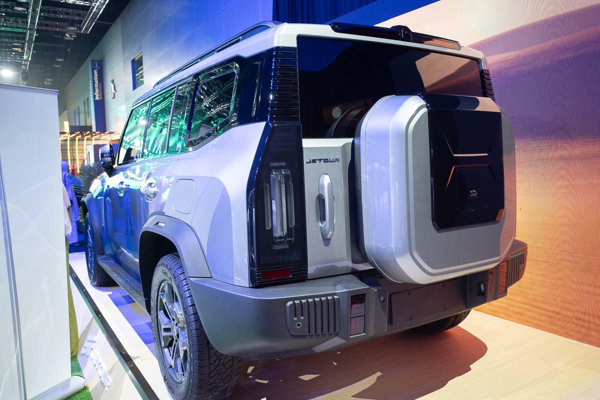 从外观来看,Jetour T2 采用近年来非常流行的“方盒子”设计语言。整车线条相当方正,车头配备大面积直立式进气格栅,并搭配矩形LED头灯组,看起来颇有几分硬派越野车的味道。前保险杠造型厚实,同时加入银色护板元素,让整辆车更有越野气息。侧面部分同样延续硬朗风格,平直的车顶线条、粗壮的轮拱以及大尺寸轮圈,都让整辆车看起来相当有力量感。至于车尾则采用外挂式备胎设计,再配上纵向尾灯布局,整体视觉效果相当醒目。