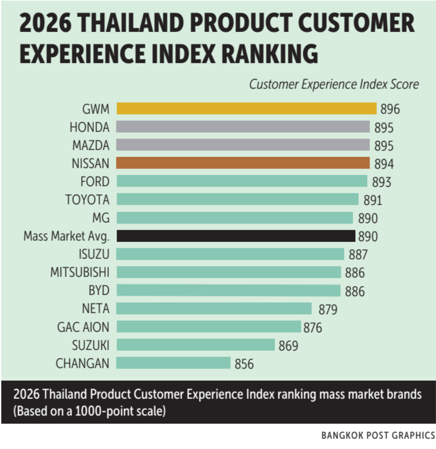 换句话说,尽管 EV 看起来很先进,但在“每天要用”的现实世界里,消费者的心还没完全跟上。有意思的是,这份榜单并不是一面倒向传统品牌。来自中国的 Great Wall Motor(GWM)反而以 896 分拿下第一名,直接压过一众日系对手。不过整体来看,日系品牌的表现依旧稳如老狗:Honda 与 Mazda 以 895 分并列第二,Nissan(894 分)、Ford(893 分)以及 Toyota(891 分)全部高于行业平均水平 890 分,说明所谓“日系光环”依然有效。