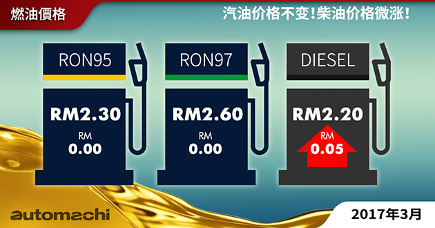 根据油站业者表示,2017年3月份汽油价格维持不变,但是柴油价格微起5 sen!最新价格为Ron 95 RM2.30/L,Ron 97 RM2.60/L,至于柴油的最新价格则为RM 2.20.